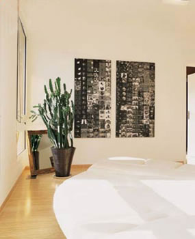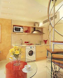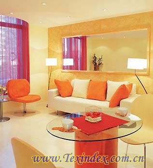 如果房間墻壁上有一塊大鏡子,鏡子里就可以反映出全屋的景象,似乎有一種房屋擴(kuò)大了的感覺,其實是這種光學(xué)幻覺在起作用。鏡子可使你感覺到房間多了一扇窗似的,并能獲得另一個光源。白色沙發(fā)、橙色椅子和靠墊、同色的墻與地面,在光與影、虛與實中回旋,安靜、高貴卻時刻閃現(xiàn)著青春的色彩。