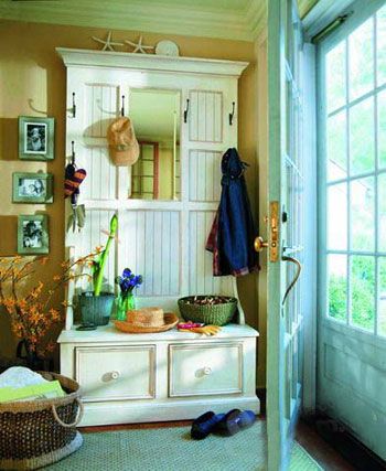 這種式樣的玄關柜漂亮而實用,下面的柜體放置脫換的鞋子,平臺部分正好可以坐在上面方便穿脫,上面的箱板釘幾個掛鉤,就能懸掛出門的行頭、帽子、書包一類的東西了,是早晨快速整理妝容的好幫手。