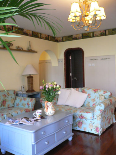 ①色彩、圖案:客廳沙發(fā)與窗簾的顏色采用相呼應(yīng)的冷色(藍(lán)色),讓空間有更開(kāi)放的感覺(jué)。圖案選擇鄉(xiāng)村風(fēng)格的典型元素條紋及花朵,使整個(gè)空間既有鄉(xiāng)村的質(zhì)樸而又不失時(shí)尚的味道…