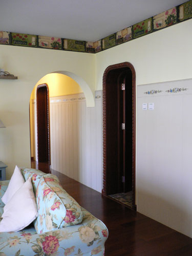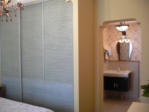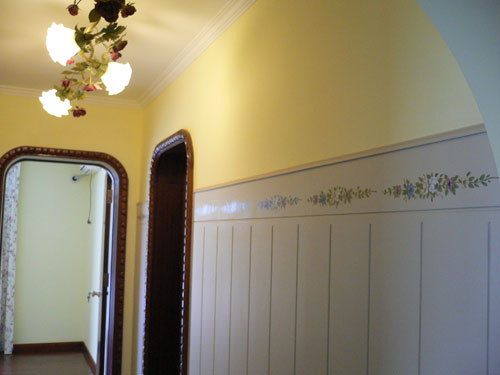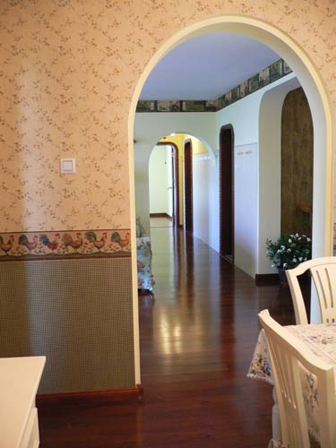 ②走廊護(hù)墻裙上貼的水移畫(huà):其花朵圖案與頂上花朵形狀的吸頂燈交相呼應(yīng)表達(dá)了一種向往自然、田園的感覺(jué)。