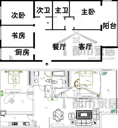 對此,設(shè)計師做了如下的調(diào)整:首先設(shè)計師把廚房的一角墻面向書房推入,從而開辟出放冰箱的空間來;主衛(wèi)的外間被作為儲物區(qū);主臥中多余而浪費空間的墻面也被拆除掉。最終的平面布置如圖所示。