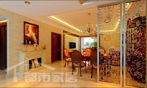 接下來看看設(shè)計師是如何“裝扮”這套新房的吧。之前我們提到了業(yè)主喜歡華麗的風(fēng)格,并且家里不時會舉行一些朋友聚會,為了體現(xiàn)出開放和大氣,淺金色的簡約歐式風(fēng)格被選定為整體基調(diào)。大理石地面的運用有助于提升居室的華麗感,而淺金色的花朵壁紙則賦予了居室貴族般的典雅氣質(zhì)。壁紙、大理石地面以及天花板的顏色都非常接近,在統(tǒng)一的基礎(chǔ)上又有一定的漸變,產(chǎn)生視覺上的延伸感,這樣可以一定程度上緩解層高很低的印象。除此之外,吊頂?shù)摹盎亍弊中伟继幚硪步o人以天花板的進深感,讓人覺得頭頂?shù)目臻g有深淺層次。最后,強調(diào)墻面的豎線條是增強視覺層高的必殺技哦。