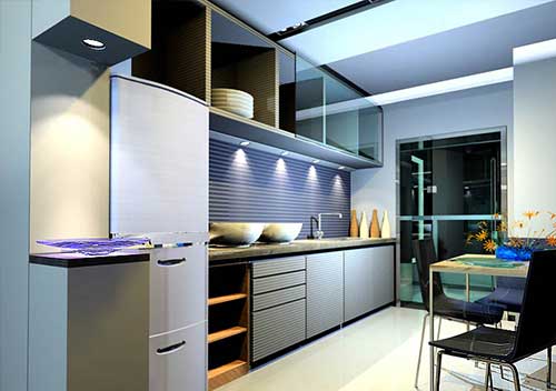 廚房里的矮柜最好做成抽屜、推拉式以方便取放,視覺較高比較好,而吊柜一般做成30-40厘米寬的多層格子,柜門做成對開,或者折疊拉門形式。