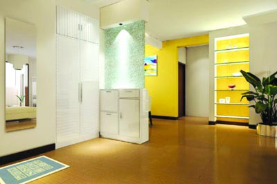 入口的正立面做了一個簡單實用的玄關(guān)柜,下面為鞋柜。鞋柜上方是塊透光不透明的裂紋玻璃,通過玻璃上面的射燈打下強(qiáng)光。