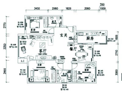 客廳:從圖紙上不難發(fā)現(xiàn)客廳電視墻過長,而且還有一個折角的墻體,這正好為解決過長的電視墻創(chuàng)造了條件。在另一側(cè)建起同原墻一樣長度的墻體,形成一個墻龕,讓客廳上方的直線吊頂與墻龕上吊頂一樣高度,并且選用同直線吊頂一樣的射燈,這樣墻龕就與電視墻形成一整體。墻龕中間的裂紋玻璃,與玄關(guān)鞋柜上的玻璃統(tǒng)一。