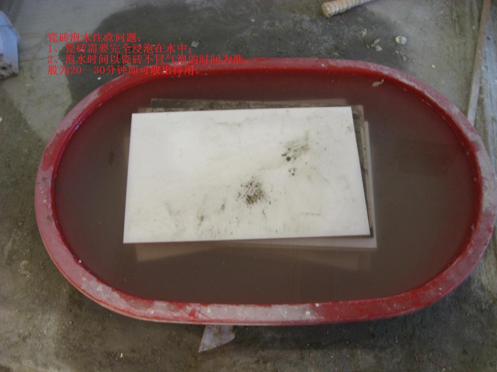 說明:墻面使用水泥砂漿在鋪貼前,瓷磚必須泡水,泡水的時間以瓷磚完全浸泡水中不冒氣泡的時間為準(zhǔn)!