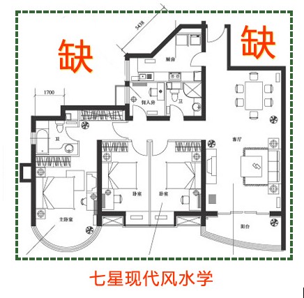 其中:缺西北為家庭男主人,缺西北男主人沒地位,事業(yè)工作都不得力;缺西南不利女主人。缺東北為最差,東北為財山、靠山、子孫山,三山之地,缺東北缺三山。