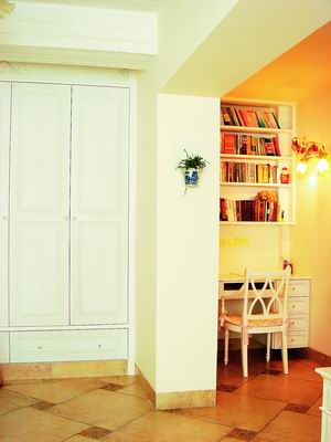 裝修后的立柱成了劃分客廳和書(shū)房區(qū)域的分界線,依立柱劃分左右兩個(gè)區(qū),左側(cè)是定做的長(zhǎng)排大衣柜,柱子右側(cè)一個(gè)多平米的地盤(pán)則變成了"書(shū)房"。麻雀雖小五臟俱全,電腦桌、書(shū)架、吊柜全都有,當(dāng)然了,家具尺寸都是依照電器尺寸量身定做的,不然哪里能活生生偷出1平米的空間呢?