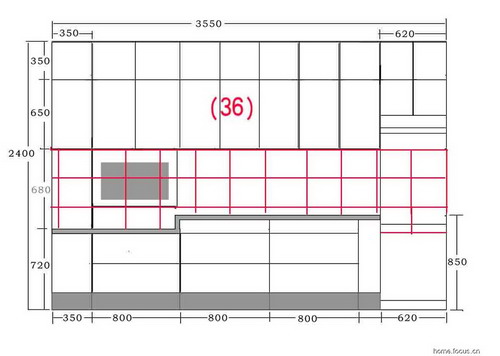 計(jì)算廚房磚可先在貼磚的墻面上排列一下,這樣雖然花費(fèi)時(shí)間,但測(cè)算出的用量比較確切,舉例說(shuō)明我怎樣計(jì)算廚房磚的用量,一般買磚是論塊,比如22元一平米的白磚,規(guī)格要是330×250,就是每塊0.0825平米,合1.815元。看圖(瓷磚計(jì)算圖3):