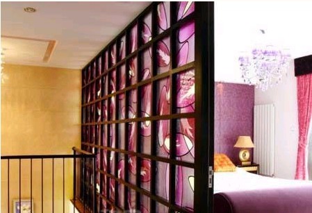 樓梯間與臥室相鄰,因為樓梯間沒有窗戶,因此采光受到了很大影響。將原有的臥室墻面改造成一面玻璃隔斷,這個問題便迎刃而解了。紫色花紋的玻璃隔斷不僅與臥室主色調(diào)相一致,并且將臥室窗外的光線“引進”到了樓梯間,讓此處的采光效果得到了極大改善。