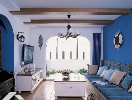 客廳里大量使用了藍(lán)色與白色,是地中海風(fēng)格中最常見(jiàn)最經(jīng)典的一種色彩組合,在讓人感到清爽、閑適的同時(shí)還擴(kuò)大了視覺(jué)效果,有效解決了空間不夠大的問(wèn)題。另外從其他一些建筑元素上,也注意突出主題,配飾和細(xì)節(jié)的處理上亦非常完美。不管整體還是局部,都浪漫而詩(shī)意