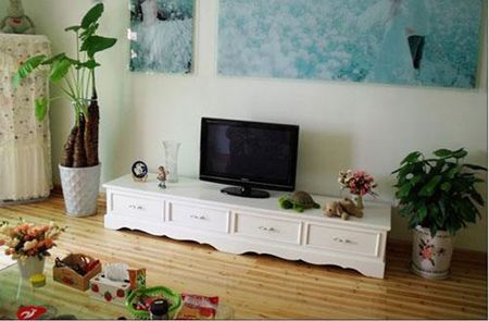 客廳里最大件家具就是電視柜了,先發(fā)張電視柜的特寫鏡頭,制作它最難的部分就是設(shè)計(jì)了,既要田園風(fēng)又要實(shí)用還要獨(dú)具特色,本想以彩繪取勝,但是電視背景墻的婚紗照已經(jīng)花色圖案太多,電視柜再彩繪,整體看上去就太繁復(fù)了,最終還是以優(yōu)雅的外形線條來標(biāo)新立異!電視柜設(shè)計(jì)制作成 兩米四的長度單層四個鑲邊立體抽屜外形附帶滑槽 加底部和側(cè)面的弧形裝飾線條突出了法式田園風(fēng)的優(yōu)雅和注重細(xì)節(jié)的修飾!