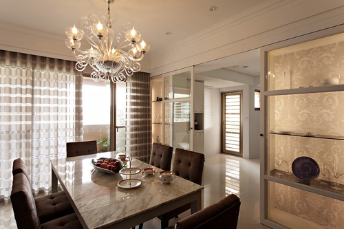 簡單線條的餐桌椅凸顯水晶吊燈的主體氣勢,拋光石英磚地面使空間敞朗明亮。