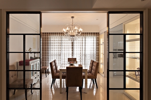 以白色烤漆與清玻璃設(shè)計對稱展示柜,拉開兩個展示柜的玻璃門片,立時變成區(qū)分客廳與餐廳空間的隔間門,是維護(hù)主人隱私及不浪費(fèi)冷氣的聰明設(shè)計。