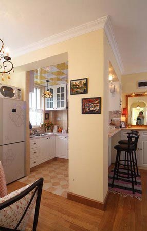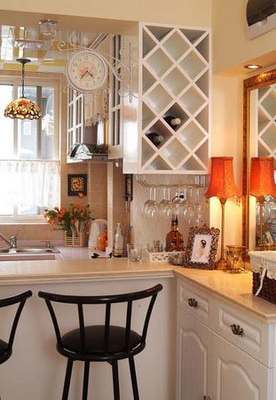半敞開式的廚房間做了造型別致的吧臺,吧臺邊上高高的坐椅,讓人覺得做飯也可以慢慢進(jìn)行,一邊做,一邊等。就像是某個下午煲一鍋養(yǎng)身湯,一邊等著湯沸,一喧拿本書靜等。