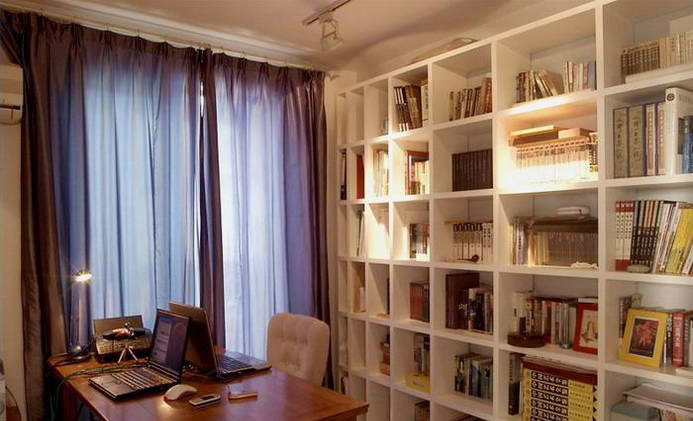 可能這個書房是整個家里最具陽剛氣息的地方了。這里是男主人的天地嗎?其實(shí)你錯了,男主人是個很疼妻子的人,臺面上兩個相對電腦就知道,其實(shí)這是他們夫妻兩人共同的書房。