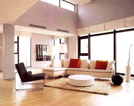 二、 裝飾材料與色彩設計 裝飾材料與色彩設計為現(xiàn)代風格的室內效果提供了空間背景。 首先,在選材上不再局限于石材、木材、面磚等天然材料,而是將選擇范圍擴大到金屬、涂料、玻璃、塑料以及合成材料,并且夸張材料之間的結構關系,甚至將空調管道、結構構件都暴露出來,力求表現(xiàn)出一種完全區(qū)別于傳統(tǒng)風格的高度技術的室內空間氣氛。在材料之間的關系交接上,現(xiàn)代設計需要通過特殊的處理手法以及精細的施工工藝來達到要求。 其次,現(xiàn)代風格的色彩設計受現(xiàn)代繪畫流派思潮影響很大。通過強調原色之間的對比協(xié)調來追求一種具有普遍意義的永恒的藝術主題。裝飾畫、織物的選擇對于整個色彩效果也起到點明主題的作用。