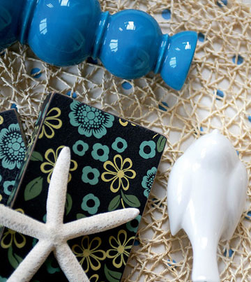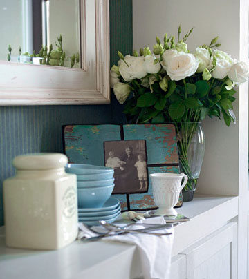 餐桌旁的餐邊柜同樣遵循白色為主調(diào),線條粗獷的藍色相框故意做舊,有種歲月沉淀的滄桑味道。奶白色的調(diào)味罐與天空藍的碗碟色澤清新淡雅,可隨意擺放在餐廳一隅,呈現(xiàn)出家的甜美溫馨。