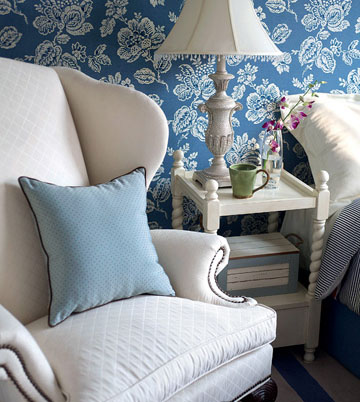 臥室一角,淡藍壁紙,白色沙發(fā)。浪漫的花朵點綴更是田園風格必不可少的裝飾。在細節(jié)中顯現(xiàn)自然樸素的鄉(xiāng)村風情。