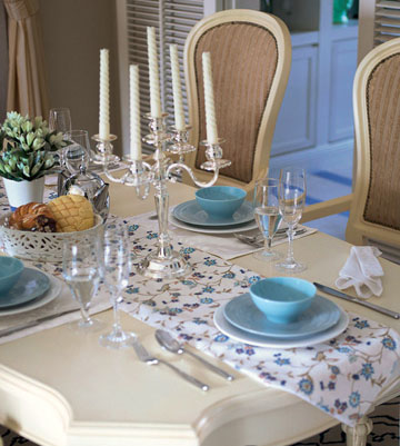 曲線柔美的白色木質(zhì)餐桌與餐椅帶有濃郁的田園風格與淡淡的懷舊味道。淡藍色餐具,白底印花桌布,再擺放上一支水晶燭臺與晶瑩剔透的高腳杯,跳躍的亮色點綴讓素雅沉靜的餐廳立刻生動起來。