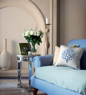簡單明快的客廳中將墻壁做出曲線輪廓,避免素色墻面過于單調(diào)。藍色的布藝沙發(fā)搭配流行的金屬鏡面茶幾,使房間整體布置干凈利落,又不失情趣。