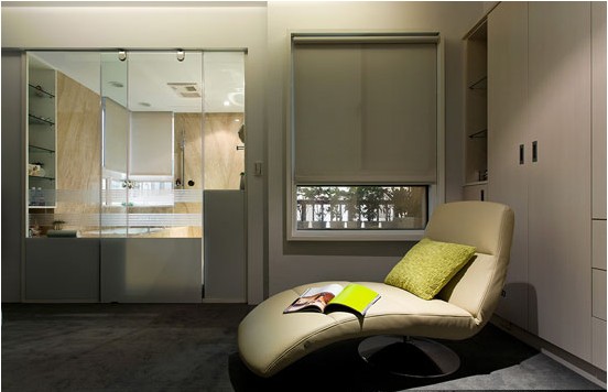 運(yùn)用清玻璃及卡典西得的材質(zhì),成為與衛(wèi)浴空間的中介因子,下方條紋的語匯與主臥床頭應(yīng)對著。地面深灰色運(yùn)用使整個空間看上去不是那么的蒼白。