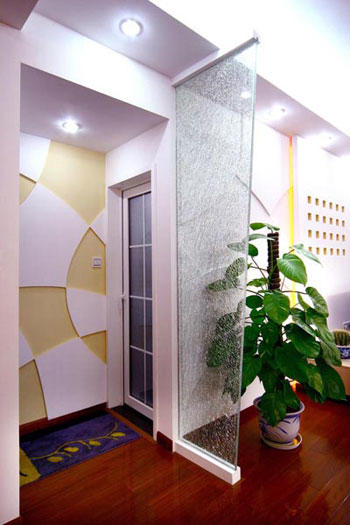 玄關(guān)一般與廳相連,由于功能不同,需調(diào)度裝飾手段加以分割,或吊頂、墻面、地面的形狀、色彩、材質(zhì)不同;或用門套、掛落、隔斷、屏風、櫥柜相隔。在平面關(guān)系上,玄關(guān)與廳應當連而不直達、隔而不斷。