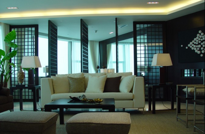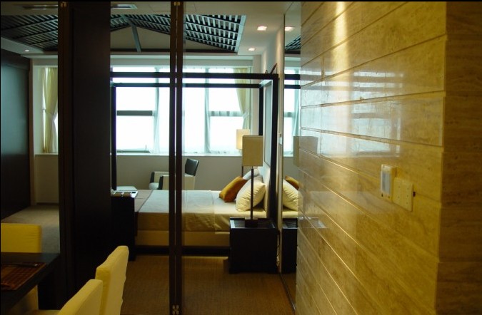 沙發(fā)背后的鏤空的隔斷相連的是兩個臥室,將休息與會客空間分隔的很清晰
