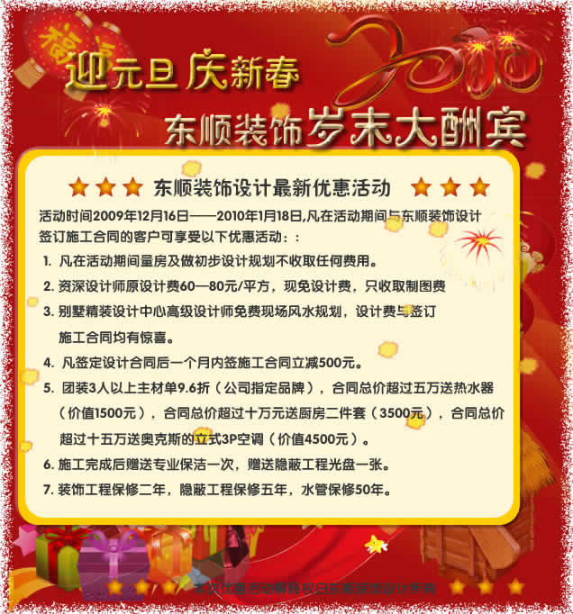 喜迎雙節(jié),各獲豐收,東順裝飾為了答謝新老客戶對東順裝飾的支持與厚愛,在新春佳節(jié)來臨之際,特推出“迎元旦賀新春”的大酬賓活動,還有更多驚喜等著您!