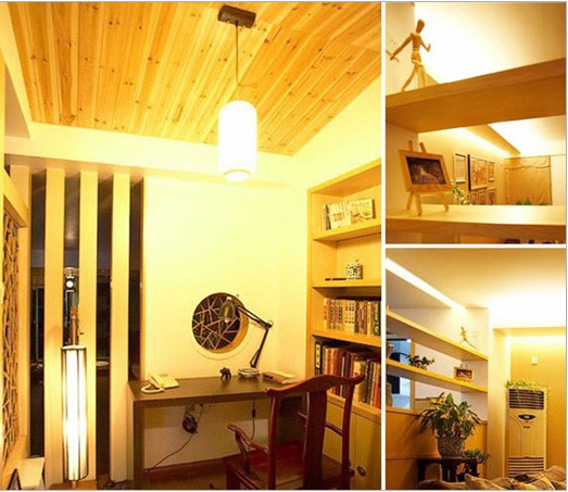 書房,運用了暖洋洋的土黃色。書房和客廳是敞開相連的,隔斷將遮未遮,擴大了空間感還能滲出一絲文化香,書桌正對面中式圓形窗,更是多了通透感。