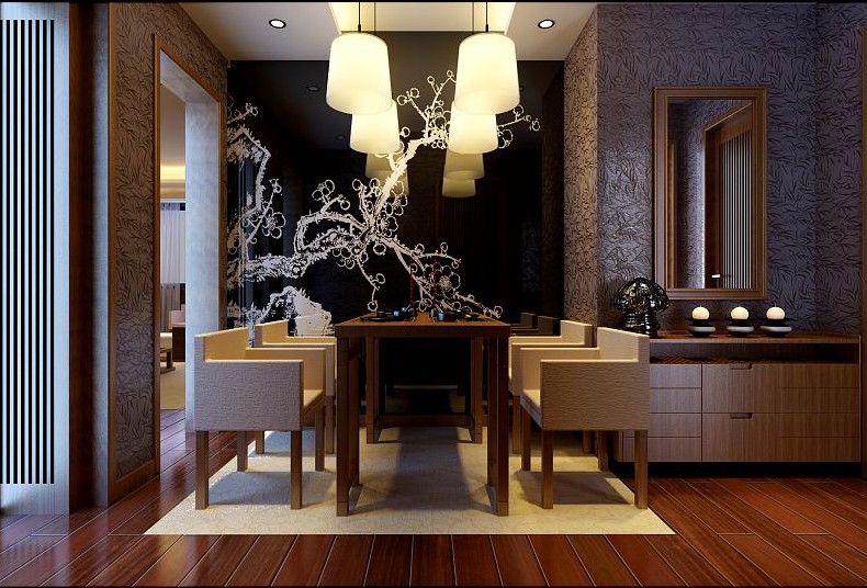餐廳利用鏡面作為餐廳背景墻,鏡面上繪制白色松樹(shù)圖案,這樣材質(zhì)的背景墻并不常見(jiàn),梅是中國(guó)自古以來(lái)一直歌詠的,永不落伍。