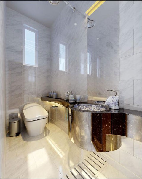 衛(wèi)生間運(yùn)用了大量的白色瓷磚,使得衛(wèi)生間看起來(lái)整潔大氣,金屬色的面盆和浴室柜在其中起到了點(diǎn)綴的作用