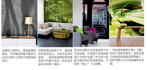 整體效果:仿照片效果的壁紙跟以往的照片裝飾有所不同,用整面墻去訴說一個(gè)主題,給人帶來的是超乎尋常的視覺震撼,用這樣的壁紙作為房間的背景,其它的家什似乎都黯淡了下來,或者說,不用特別地精心布置,擁有仿照片效果的大氛圍已經(jīng)注定了這樣的空間會(huì)不同尋常,仿照片效果的壁紙通常采用局部鋪貼的手法,因?yàn)?,局部的裝點(diǎn)已經(jīng)可以給空間帶來足夠的影響力,仿照片效果壁紙的“照片”內(nèi)容十分具象,建筑、人物、花草……但逼真的程度足以以假亂真,讓人同時(shí)體驗(yàn)著壁紙與影像帶來的空間樂趣。