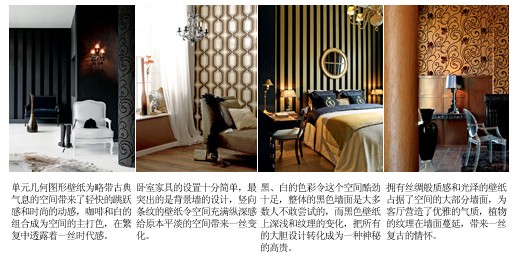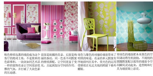 整體效果:壁紙的色彩十分廣泛,不同材質(zhì)的壁紙可以產(chǎn)生不同的色彩氛圍和質(zhì)感,紙基壁紙和PVC壁紙比較普遍,色彩眾多,容易清潔;而織物壁紙和植物壁紙?jiān)诹Ⅲw感的塑造上比紙基壁紙要略勝一籌,但是清潔起來比較麻煩,凹凸紋理的細(xì)節(jié)需要在保養(yǎng)上下一番工夫;其它的壁紙,如金屬壁紙、熒光壁紙可以產(chǎn)生一些特殊的效果來裝點(diǎn)房間。和絢麗色彩相映成趣的當(dāng)然是壁紙上的圖案,最常見的使用方法是在整體氛圍確定后,以局部點(diǎn)綴一些帶有花紋的裝飾圖案,把人的視覺重點(diǎn)自然地過渡到帶有圖案的墻面上,令鮮亮的色彩和各種圖案完美地融合在一起。