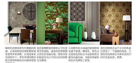 整體效果:異域元素的壁紙在色彩上十分低調(diào),通常最突出的表現(xiàn)是壁紙上帶有異國特色的紋理裝飾,不同的花紋能帶來不同國度的韻味,不同的植物更有不同地方區(qū)域的特點(diǎn),用深色或者單一色彩打底才能凸現(xiàn)這些花紋帶來的異域風(fēng)情,異域元素的出現(xiàn)可以恰到好處地安撫普通空間的過于平淡,也可以彰顯個(gè)性空間的獨(dú)特審美,為空間蓋上時(shí)尚的印章。與異域元素搭配的家具大多線條簡潔,在質(zhì)感和細(xì)節(jié)的設(shè)計(jì)上卻有過人之處,精致和細(xì)膩的家具是異域風(fēng)情最好的詮釋。