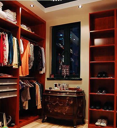 對(duì)于120平方米以下的戶型來說,如果戶型結(jié)構(gòu)中存在不規(guī)則空間,可以將它改造成步入式衣帽間。例如L形房的一角、過道、多余衛(wèi)生間改造、在臥室里分割空間。這類衣帽間多設(shè)一些抽屜、小柜,以實(shí)用為主。除了儲(chǔ)藏衣物外,這類衣帽間還可作為化妝間、試衣間、臥室和衛(wèi)生間的功能補(bǔ)充作用??紤]主人的生活方式,有的衣帽間還設(shè)置小冰柜茶水柜,臺(tái)面上放置電源,供主人夜間取水之用。