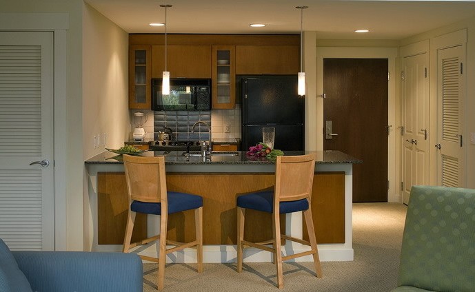 空間較小的情況下,廚房不適合單獨隔起。這樣的島臺的設(shè)計既將廚房與其他空間相隔離,又營造了時尚的居家氣氛。