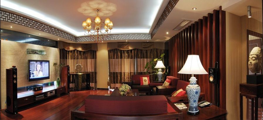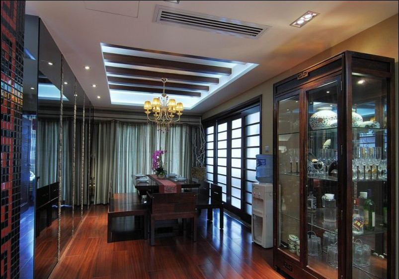 整個客廳的家具擺設都以中式風格為主,古色古香。餐桌上方的吊燈確是歐式風格,現(xiàn)代感體現(xiàn)。
