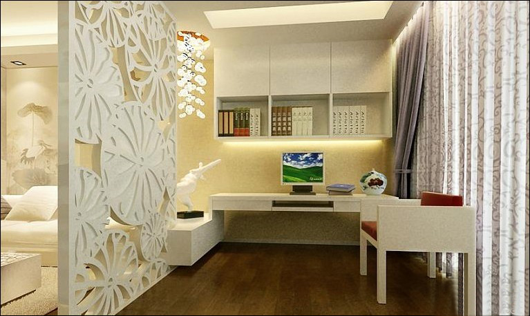 小空間里依然是每個區(qū)域分隔的很清楚,小書房同客廳雖然只有一個鏤空隔斷